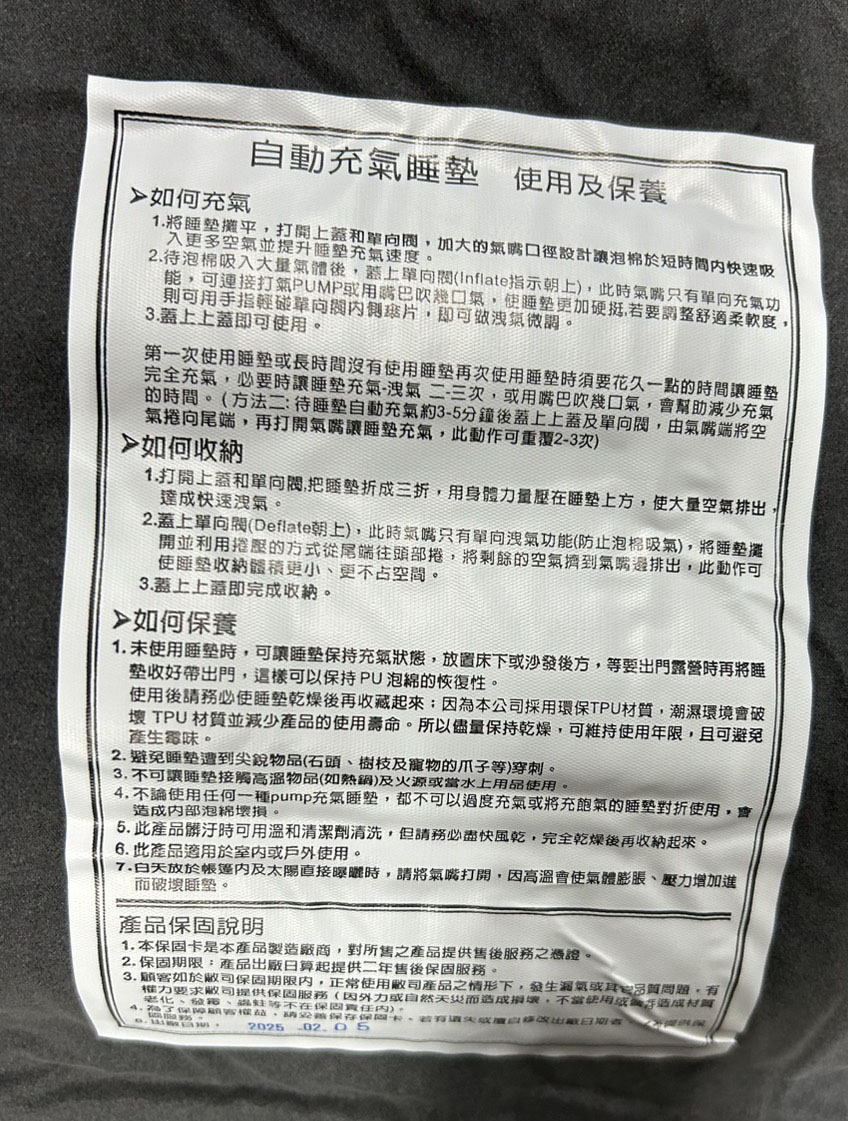 ( 第一次使用時,可能會花久一點的時間讓睡墊完全充氣,請參考以下注意事項) 。