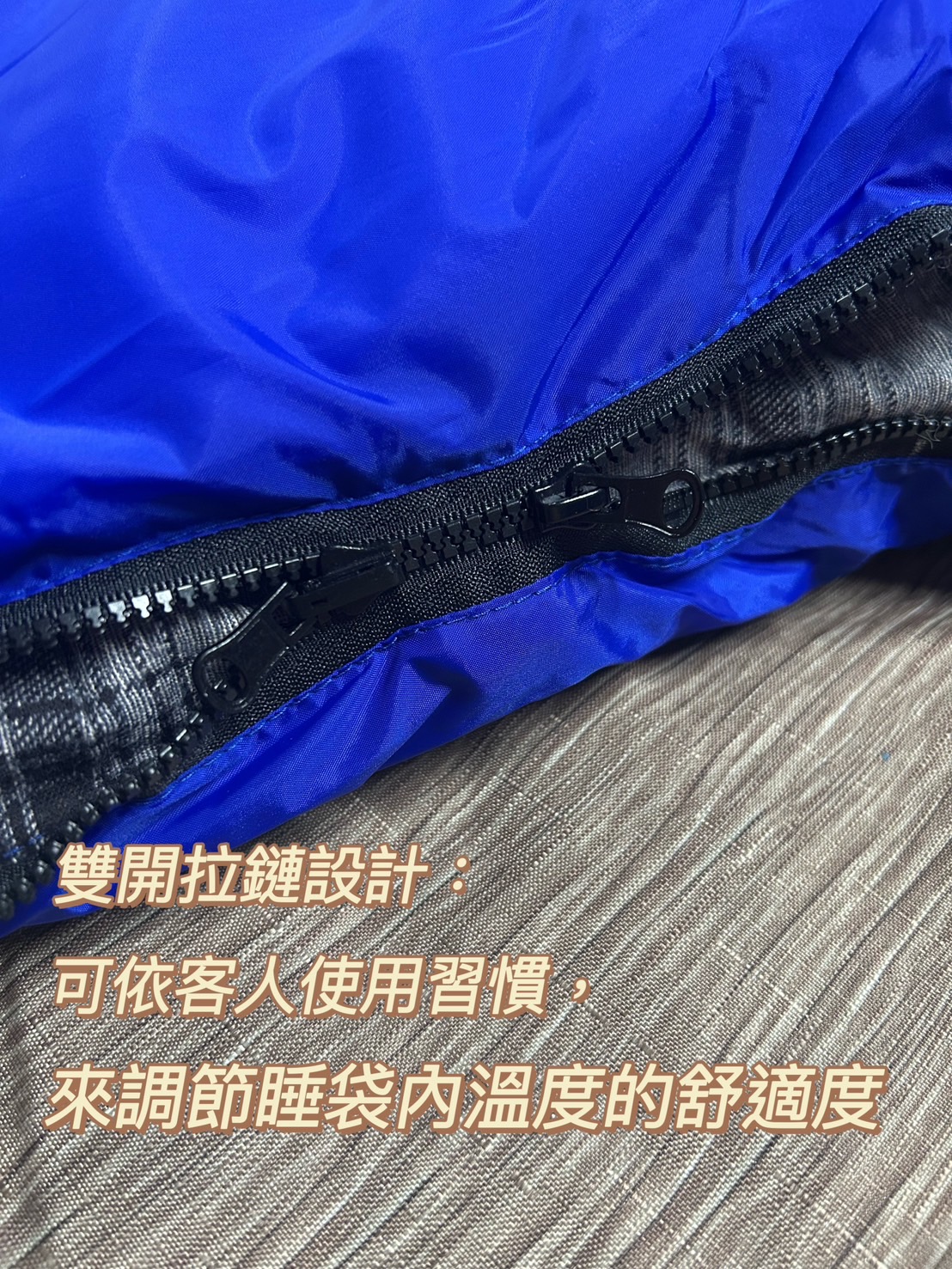 ◆雙開拉鍊設計,可依據不同氣候及個人使用習慣,來調節睡袋內溫度的舒適度 。