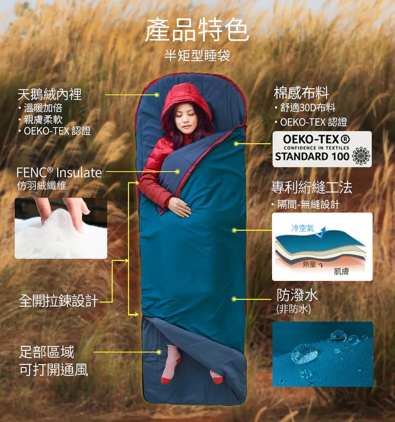 好消息是,我們為你找到了解決方案!我們的睡袋使用FENC® Insulate仿羽絨纖維作為填充物,不僅輕量,而且保暖效果極佳,可以在攝氏零度下使用,讓你的戶外之旅不再受到氣溫的限制。