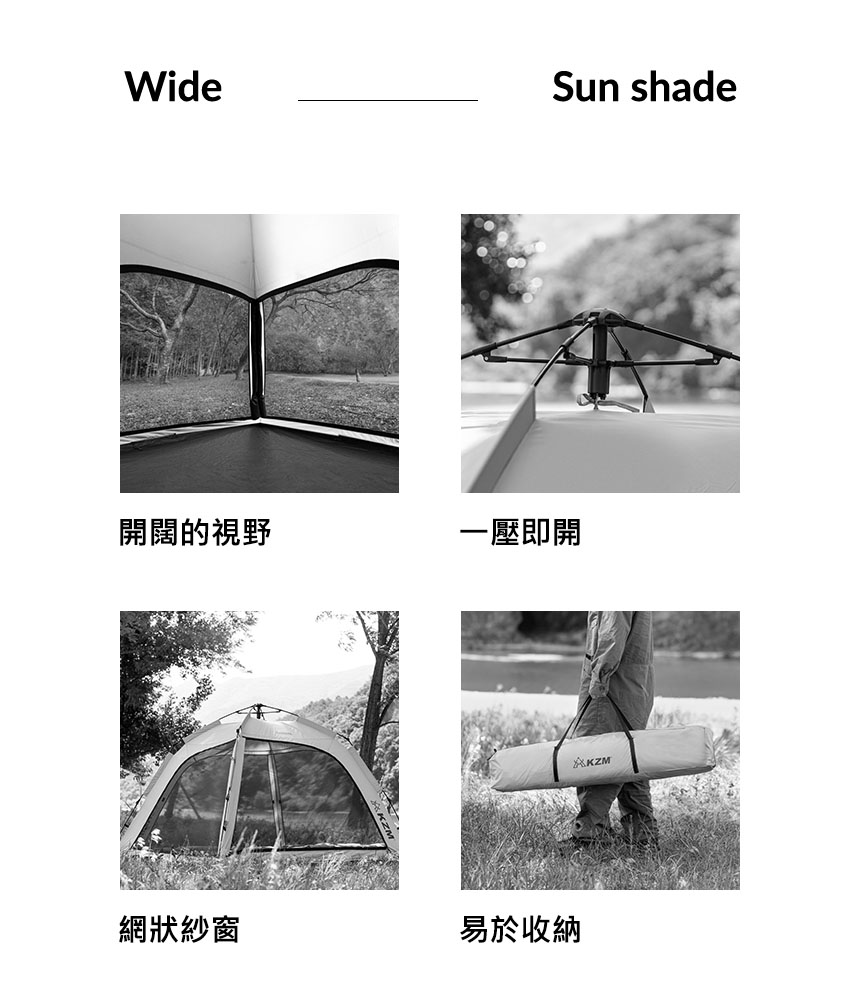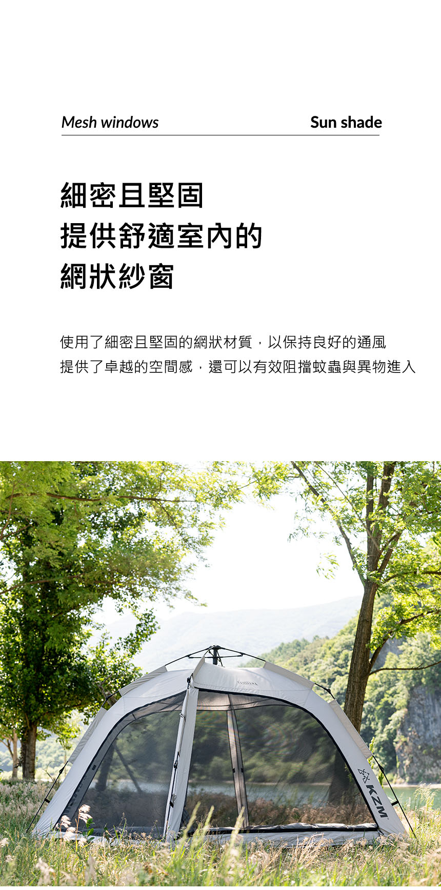 ● 多功能速搭加寬野餐帳 : 四面紗窗提供了開闊的視野和開放感,採用一壓即開的設計,可輕鬆安裝