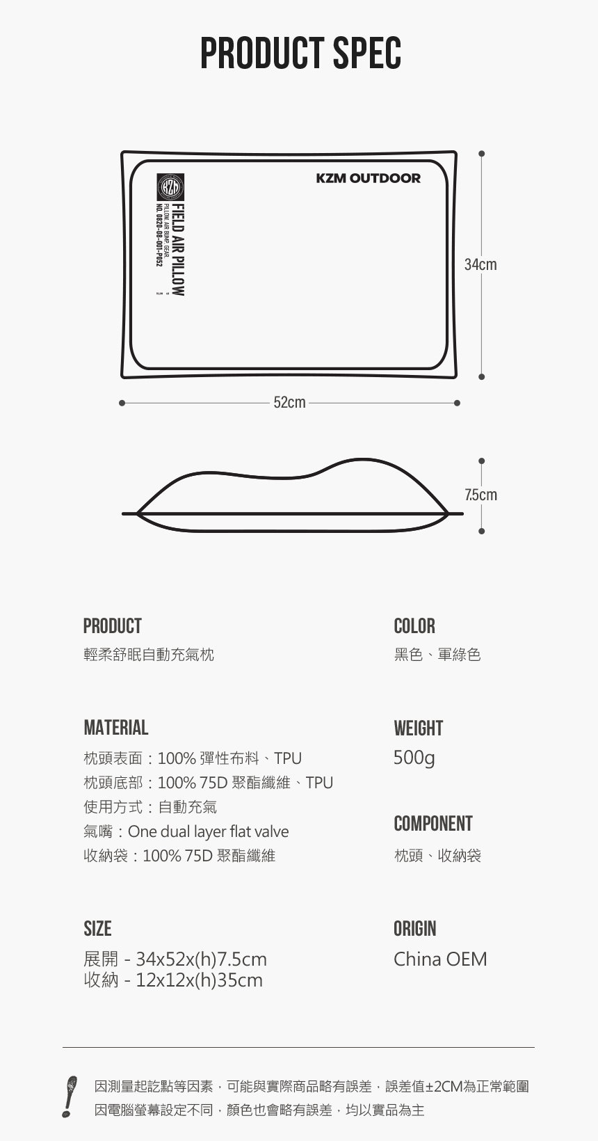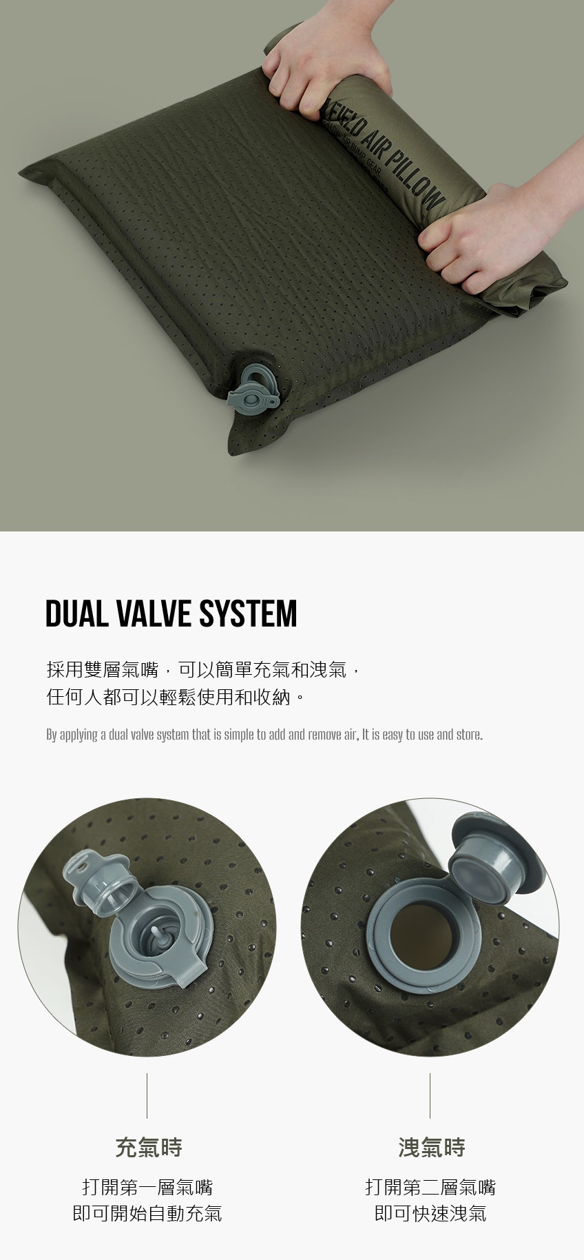 【JIALORNG 嘉隆】KZM 輕柔舒眠自動充氣枕(軍綠) 充氣枕頭 露營枕頭 收納枕