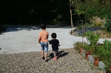 大人在收帳時,丞也乖乖的自己坐在陰涼處,玩玩具。