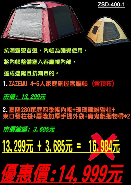 ZAZEMU ZSD-400-1 舒適4人客廳型睡帳(點我) + ZAZEMU ZSD-400-2 輕量2人客廳型睡帳(點我)+1,100