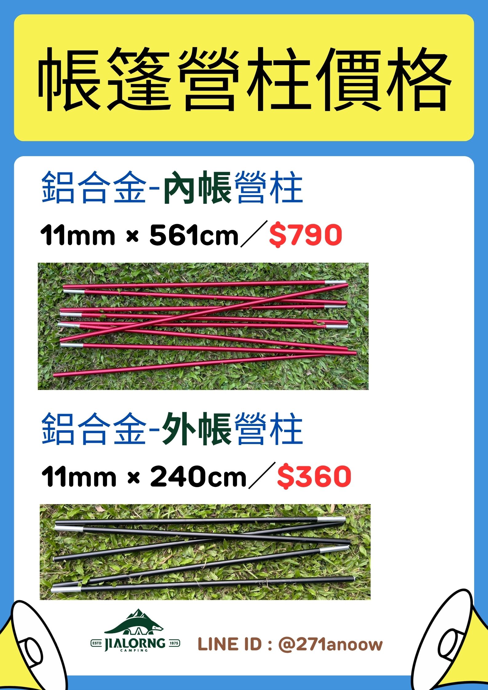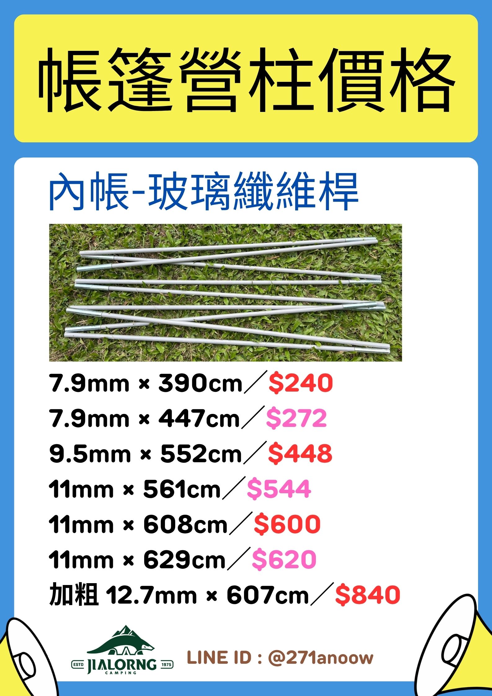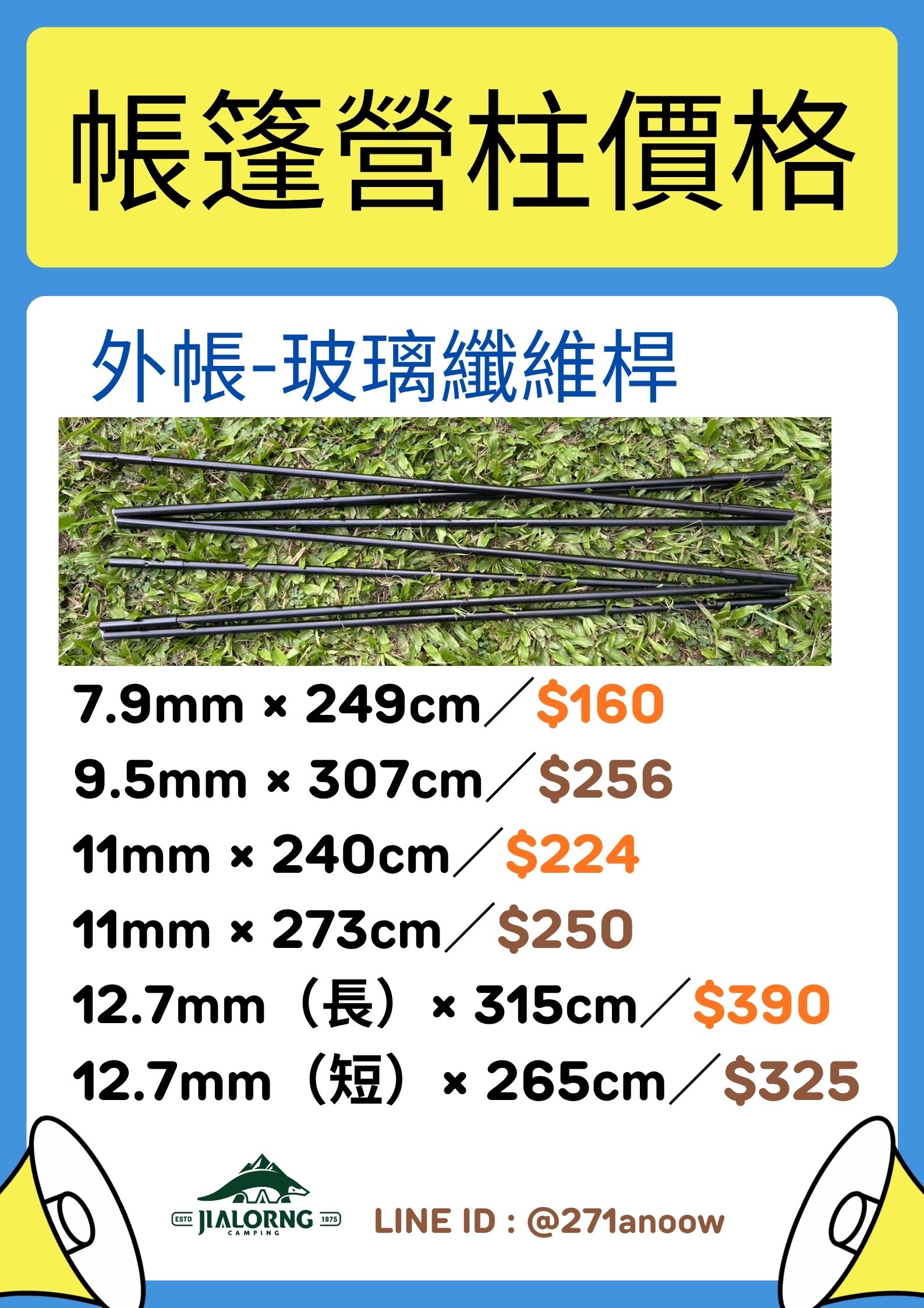 【帳篷營柱 - 玻璃纖維營柱 / 鋁合金營柱 價目表】