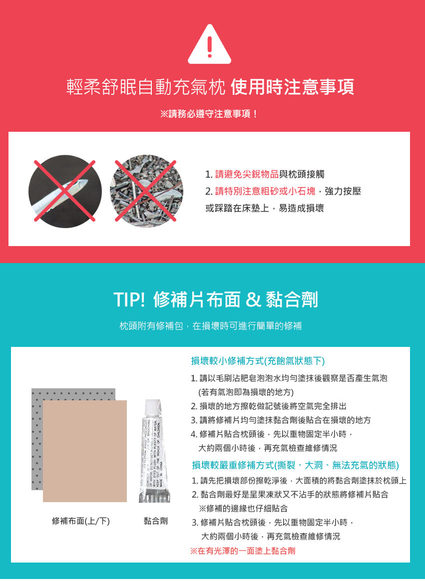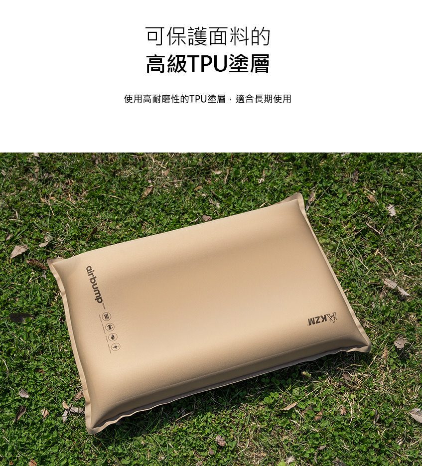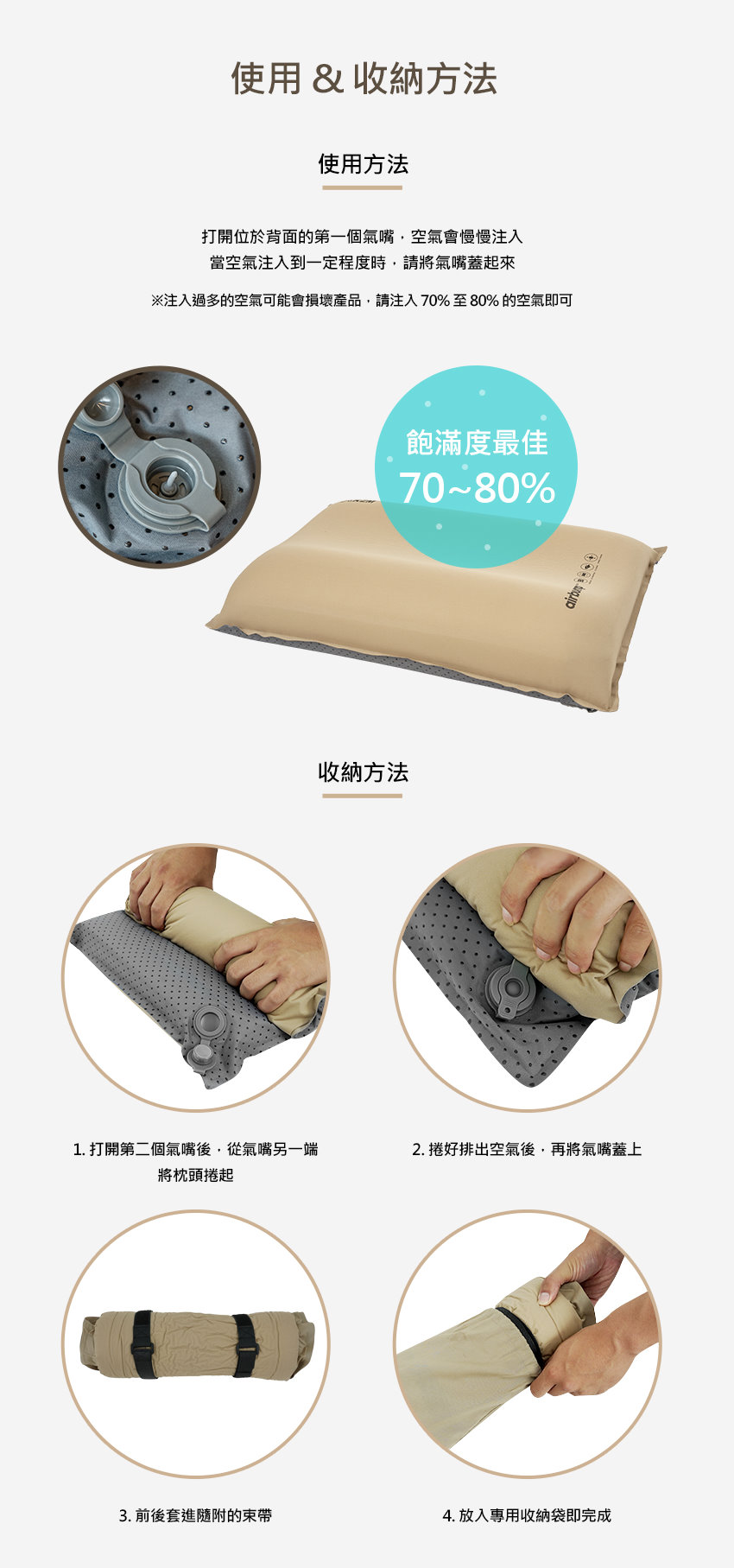 材質 : 枕頭表布-30D Stetch Fabric、TPU/枕頭底部-190T Polyester with Ripstop ;TPU/氣嘴-dual layer valve