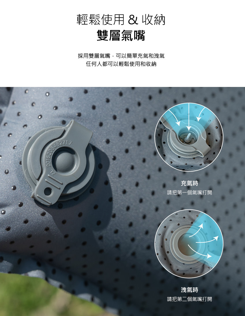 ● 採用雙層氣嘴,可以簡單充氣和洩氣,任何人都可以輕鬆使用和收納