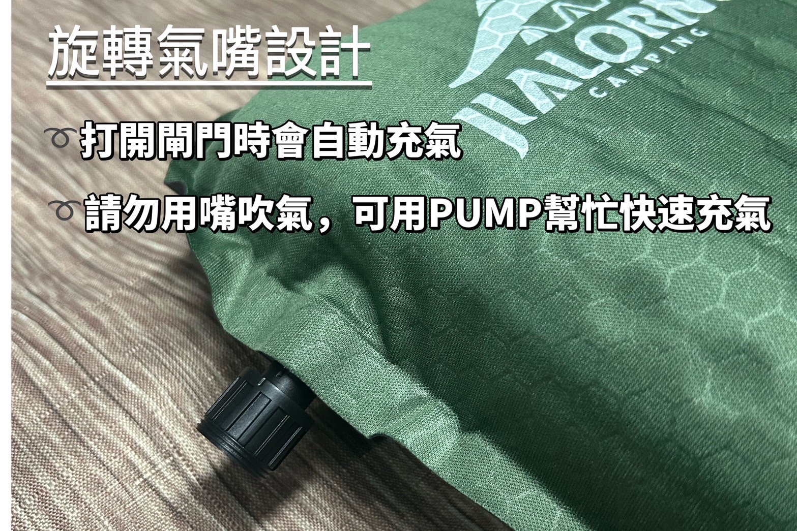 2.旋轉氣嘴設計: 打開閥門時會自動充氣(請勿用嘴吹氣,可以用PUMP幫忙快速充氣)。