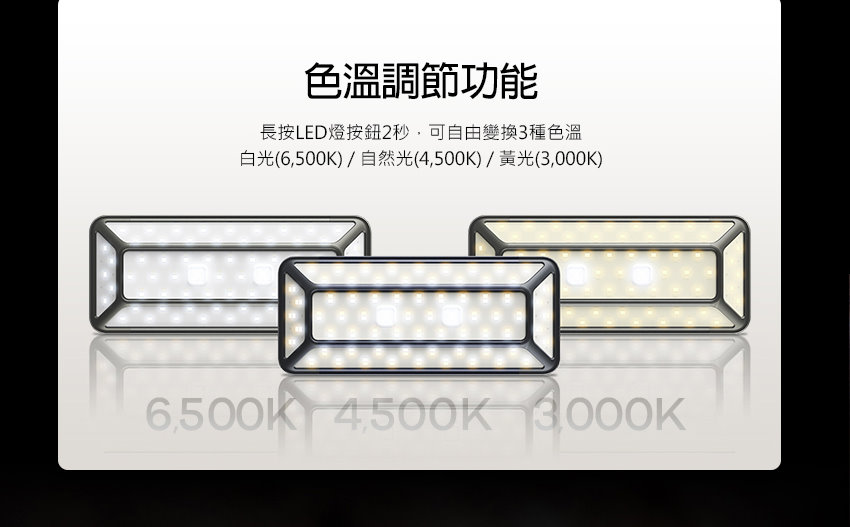 LED 色溫(變換): 3,000K(黃光)/4,500K(自然光)/6,500K(白光)