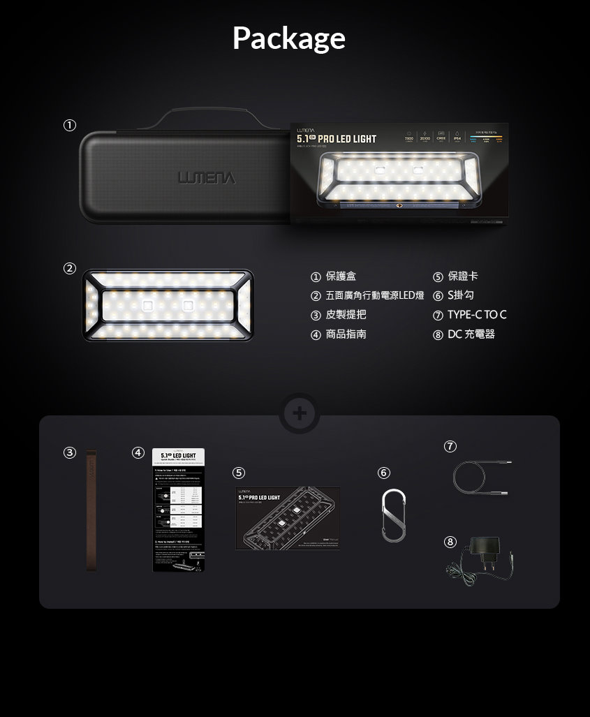 內容物 : 本體、保護盒、TYPE-C 充電線、DC充電器、S掛勾、皮製提把、保證卡、商品指南