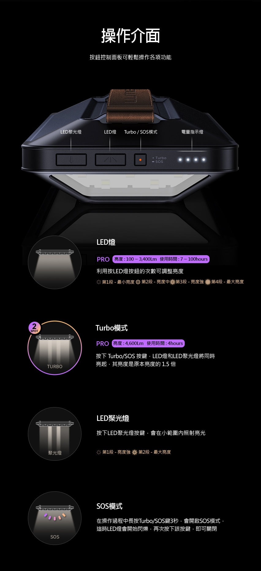 使用時數 : 最小亮度 100小時/最大亮度7小時/Turbo 4小時