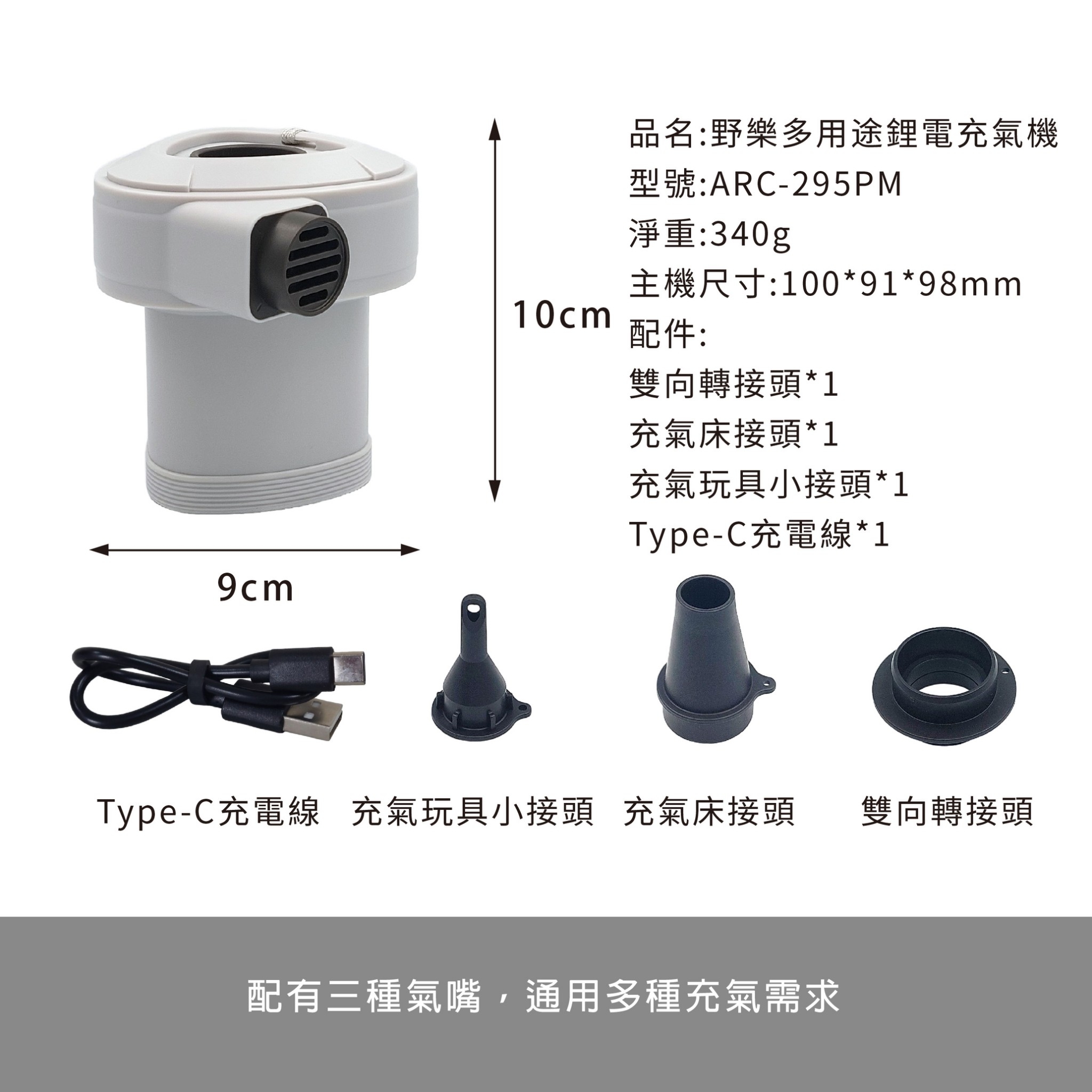 配件:雙向轉接頭*1、充氣床接頭*1、充氣玩具小接頭*1、Type-C充電線*1