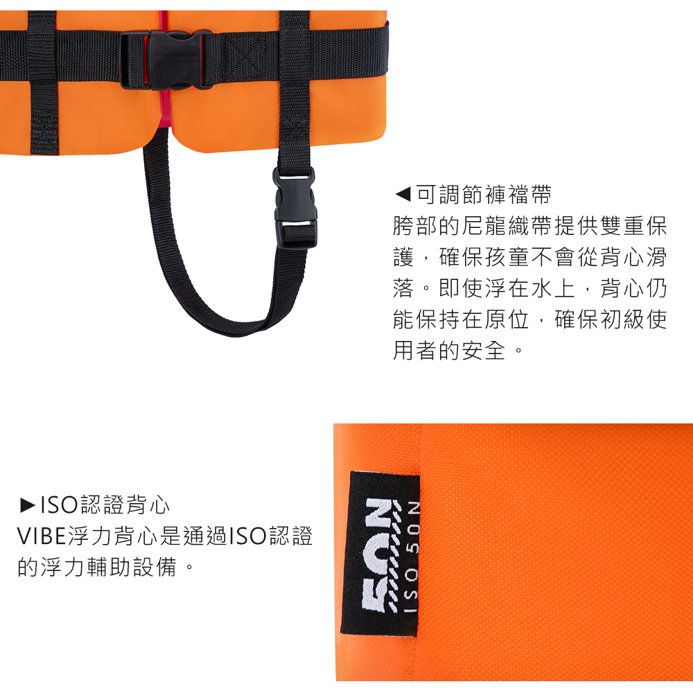 ● ISO認證背心 : VIBE浮力背心是通過ISO認證的浮力輔助設備。