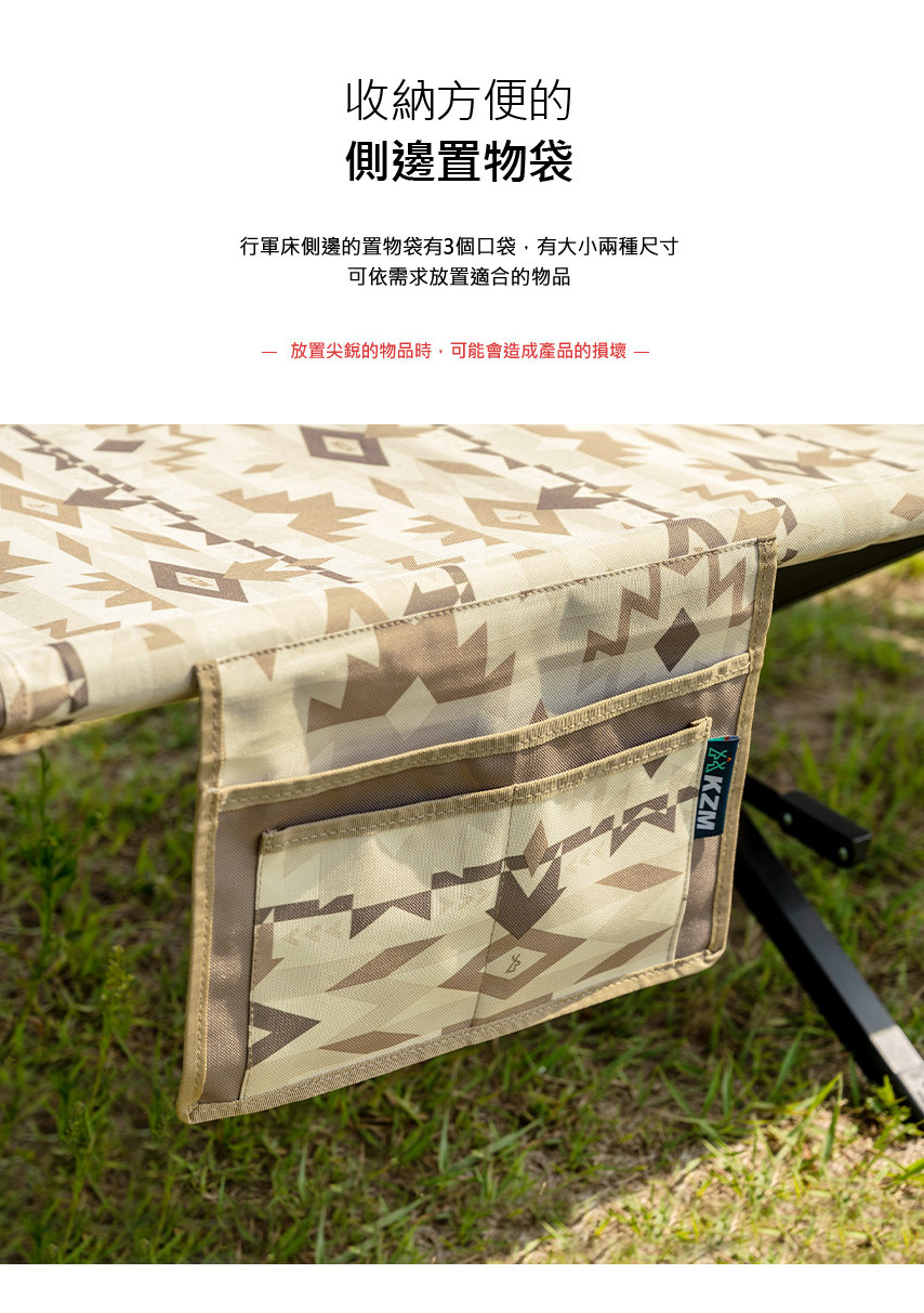 ● 行軍床側邊的置物依有3個口袋,有大小兩種尺寸,可依需求放置適合的物品