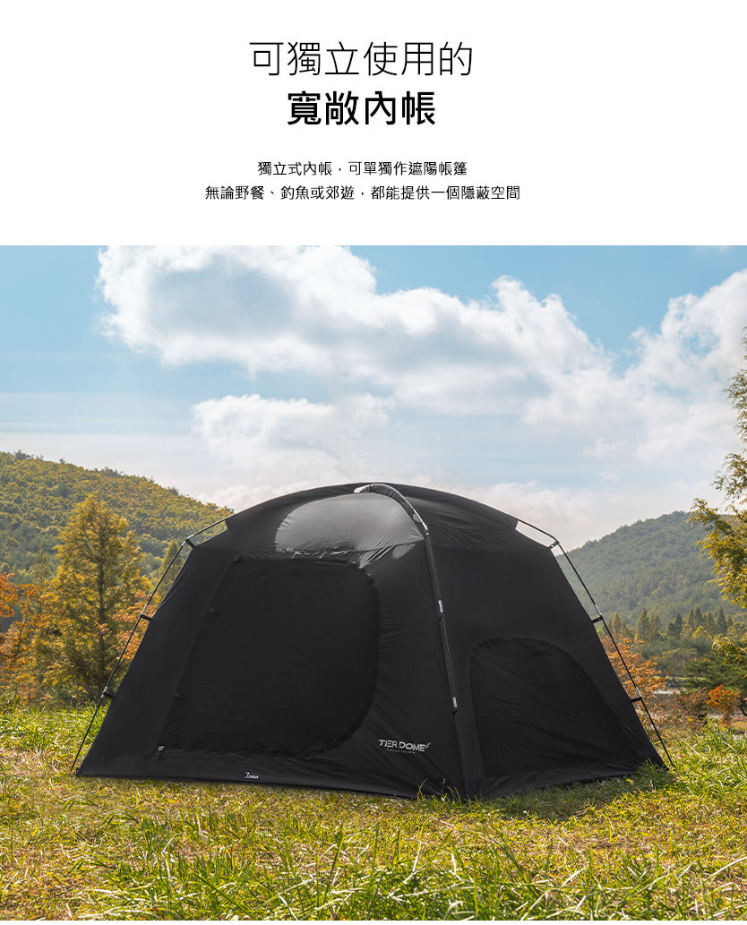 ● 獨立式內帳,可單獨作遮陽帳篷,無論野餐、釣魚或郊遊,都能提供一個隱蔽空間
