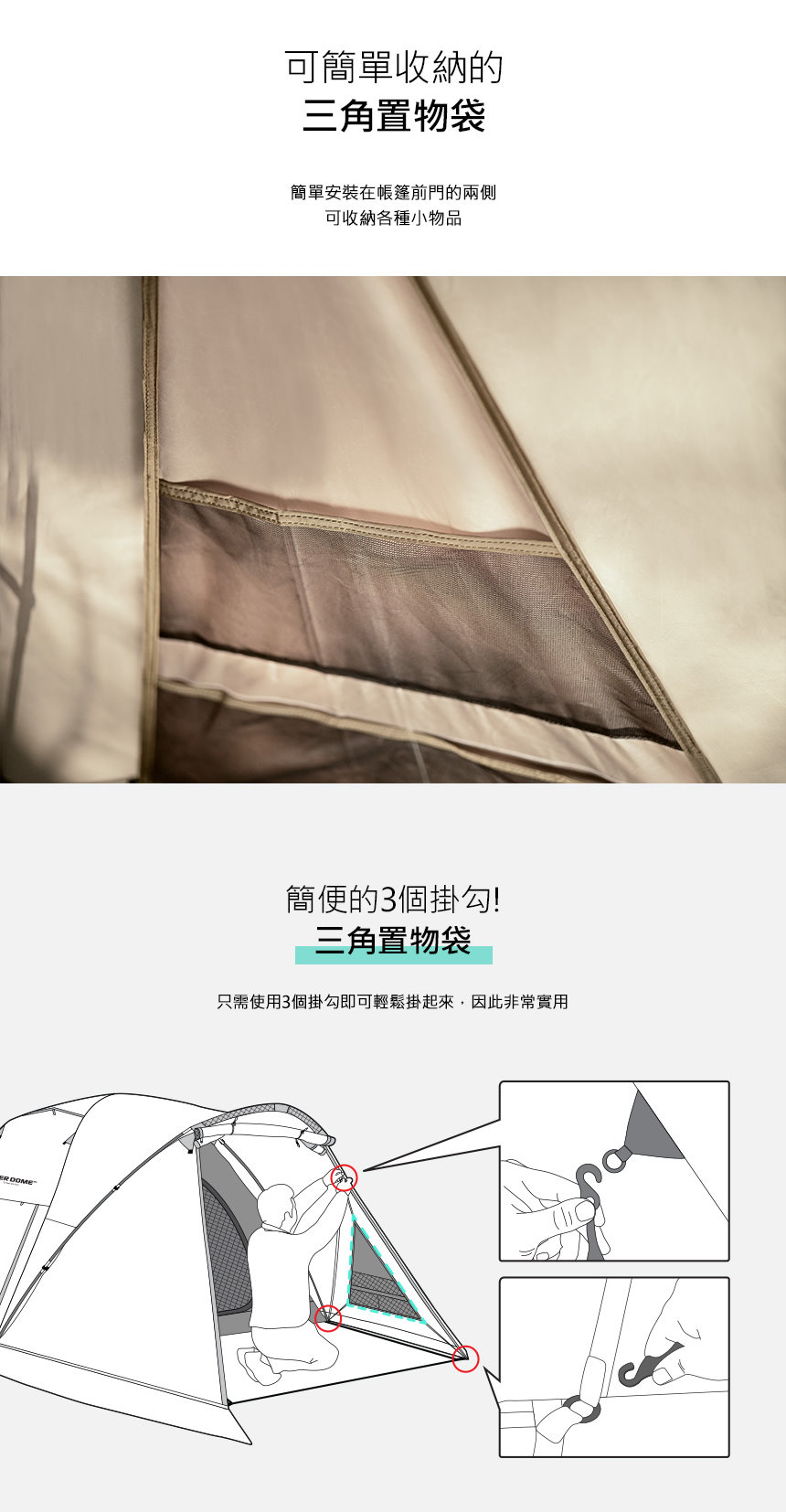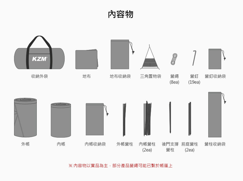 內容物 : 外帳、內帳、地布\ 三角置物袋、外帳營柱、內帳營x2ea、後門支撐營柱、前庭營柱x2ea、營釘x19ea、營繩x8ea、收納袋