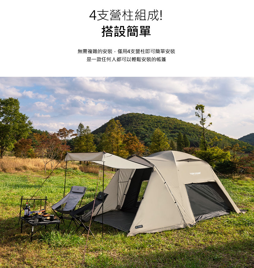 ● 無需複雜的安裝,僅用四支營柱即可簡單安裝,是一款任何人都可以輕鬆安裝的帳篷