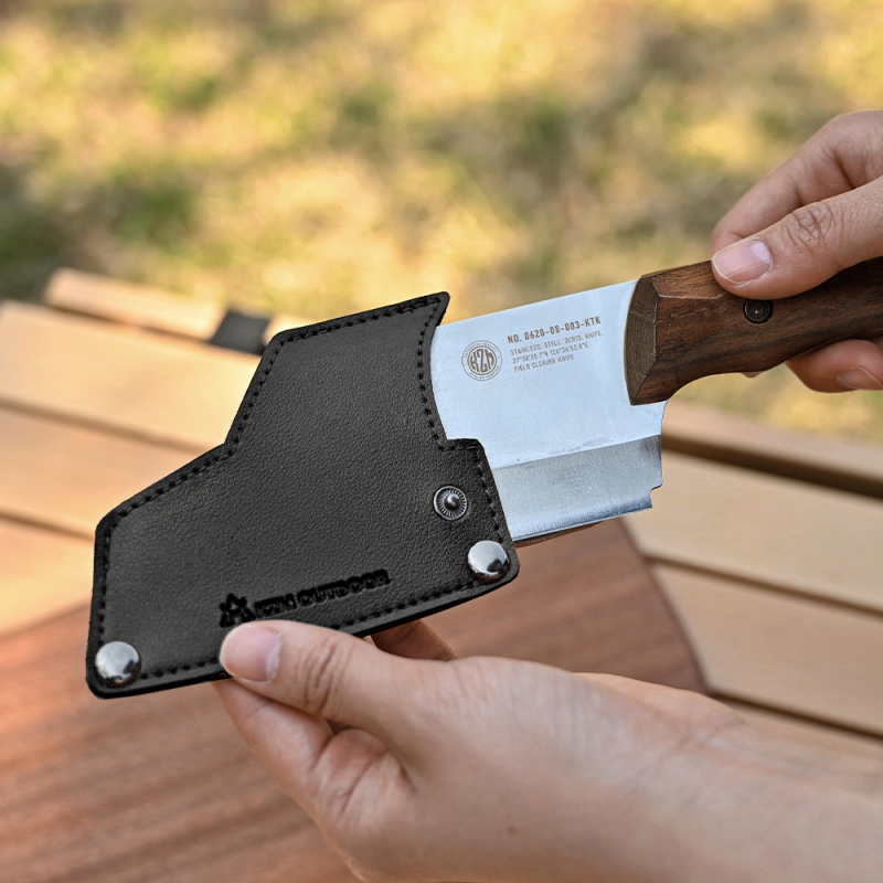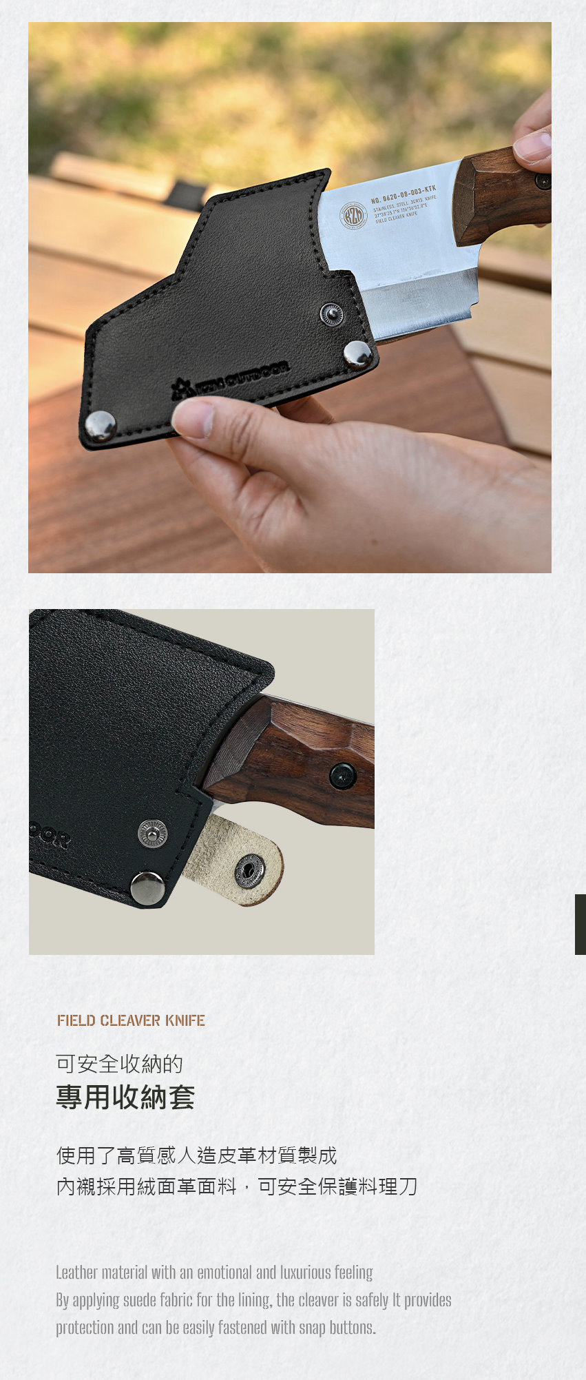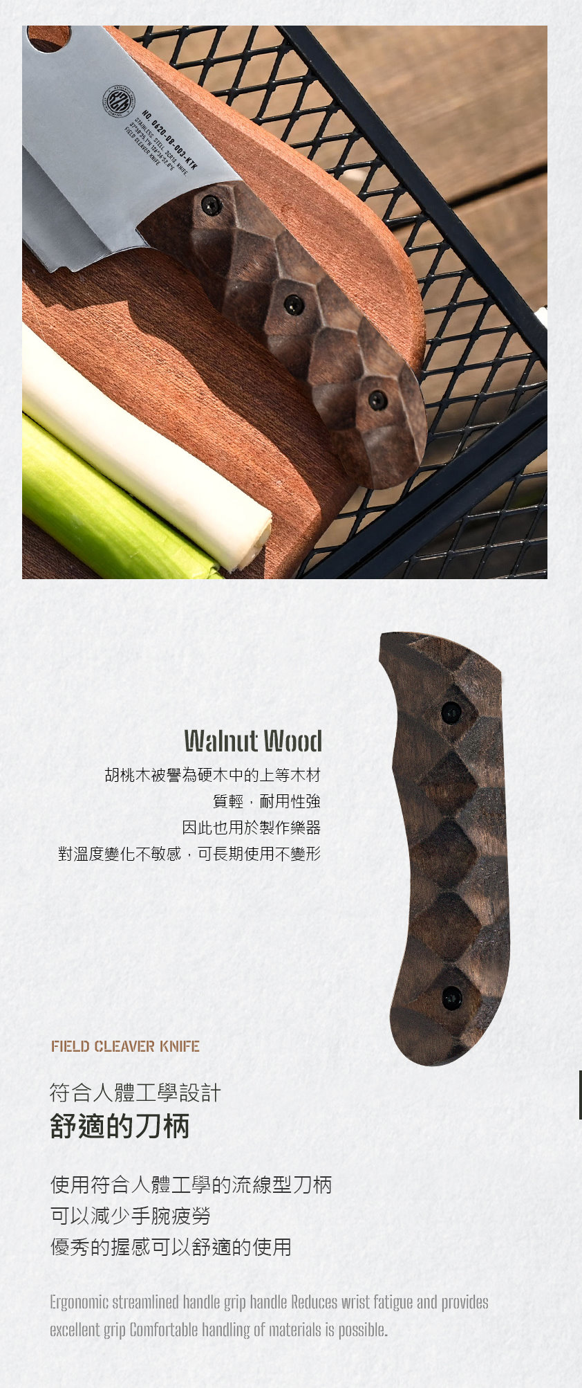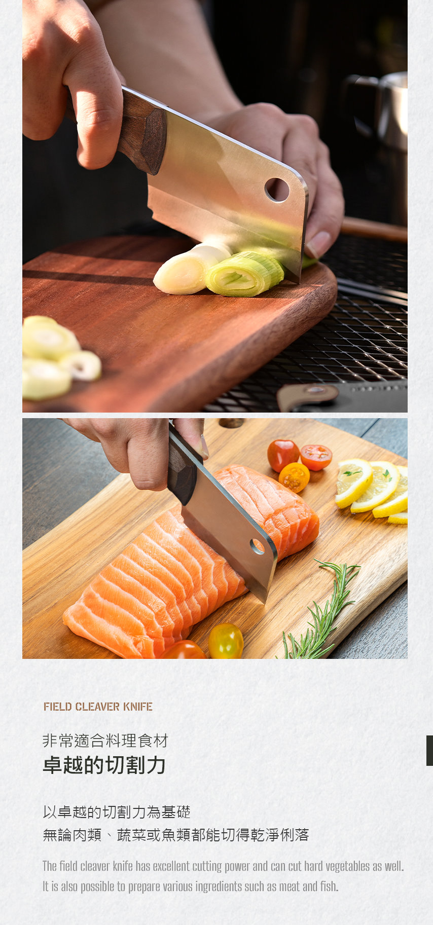 ● 戶外潮流風格的工業風木柄料理刀,採用不鏽鋼製成,且有卓越的切割力,符合人體工學設計的木質刀柄,可以更安全、更舒適的使用