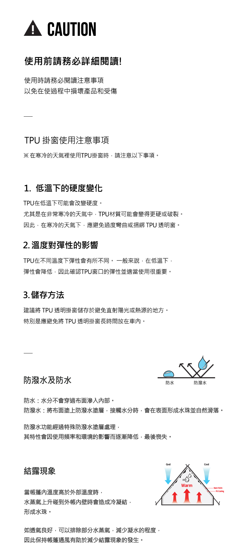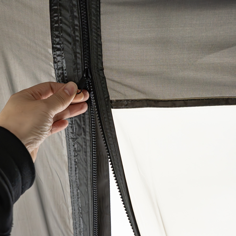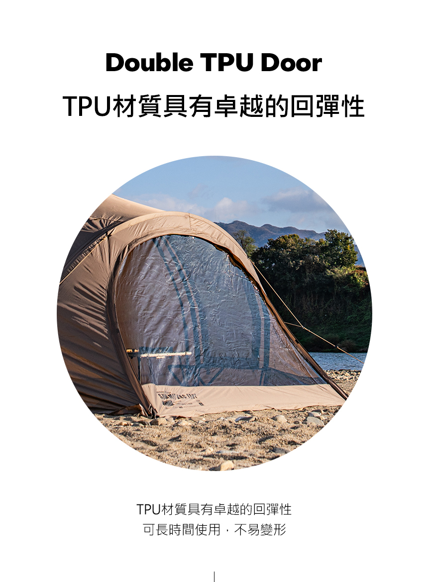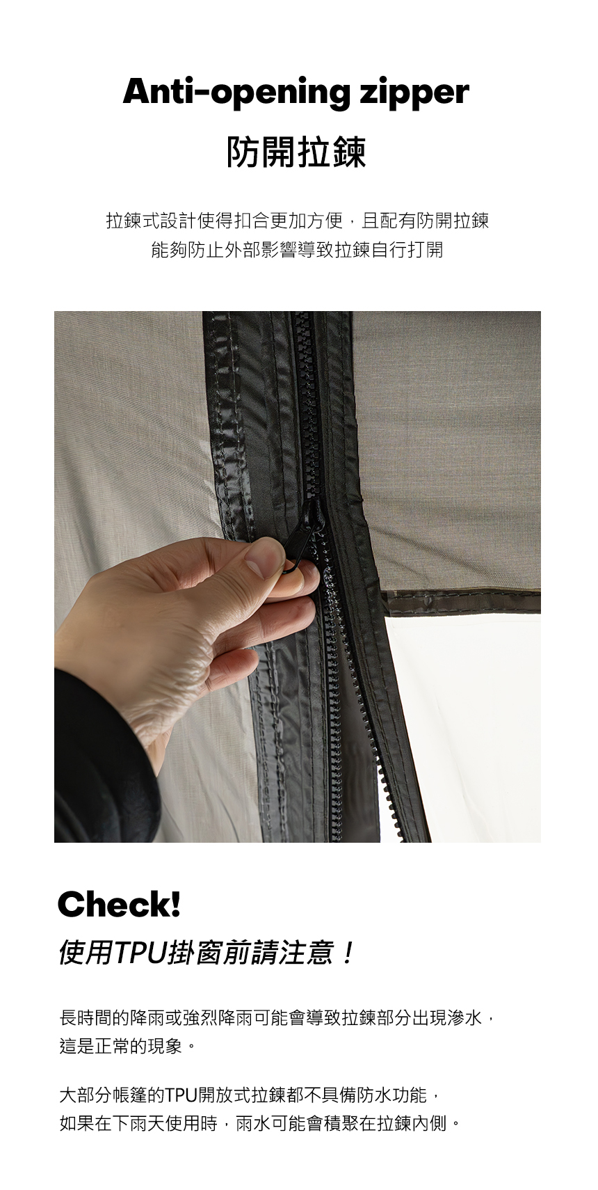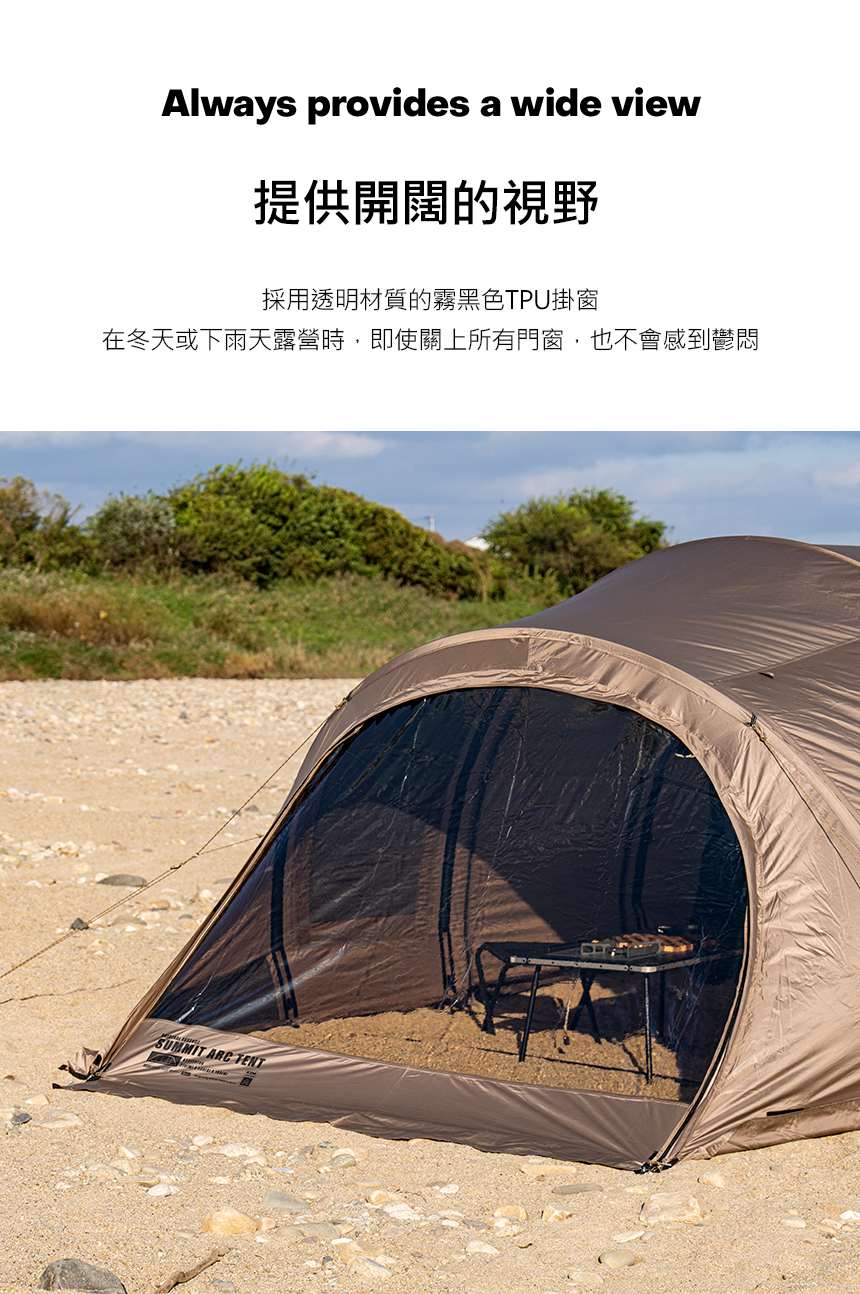 ‧採用透明材質的霧黑色TPU掛窗,在冬天或下雨天露營時,即使關上所有門窗,也不會感到鬱悶