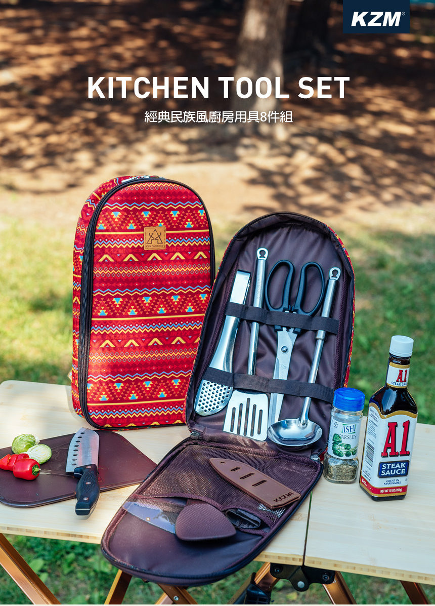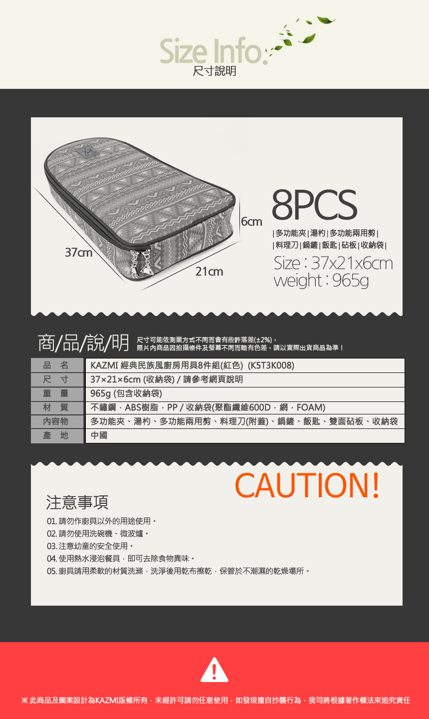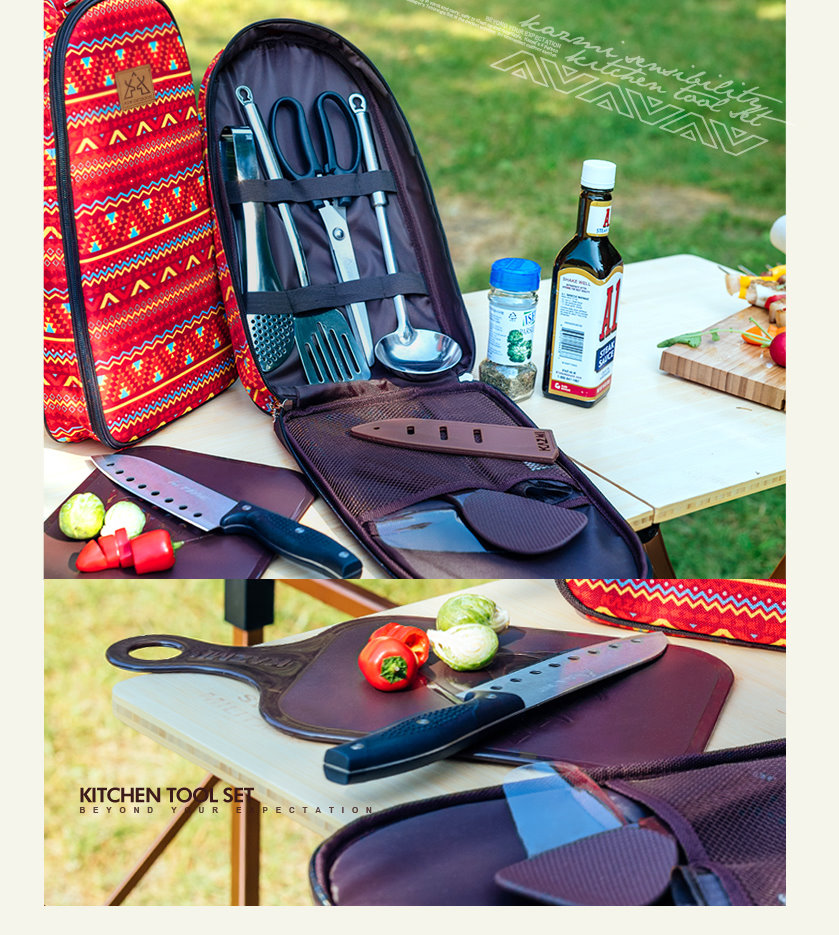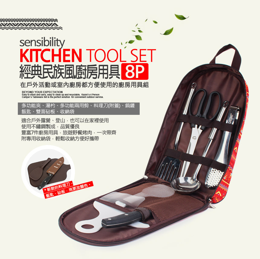 內容物 : 料理刀(附蓋)、食物剪、多功能夾、湯杓、鍋鏟、砧板、飯匙、收納袋