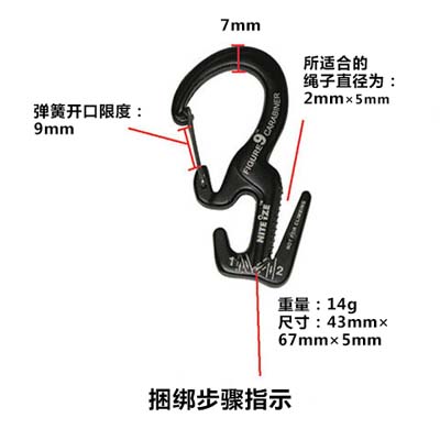 5.使用彈簧鉤,可快速掛扣較重物品,操作簡單,按照圖示操作繩子,拉緊繩子並保持拉緊狀態即可。