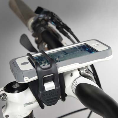 手機搭扣是由一根輕量的彈性硅膠綁帶和一個鋁制搭扣配合組成的,設計簡單但很有效,可以把手機直著橫著綁在車把上,