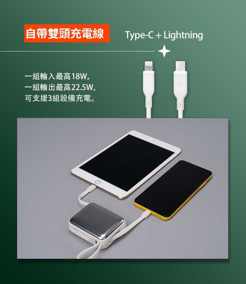 ✓ 自帶雙頭充電線,usb-c & lightning雙頭,一組輸入最高18W, 三組輸出最高22.5W,可支援3組設備充電