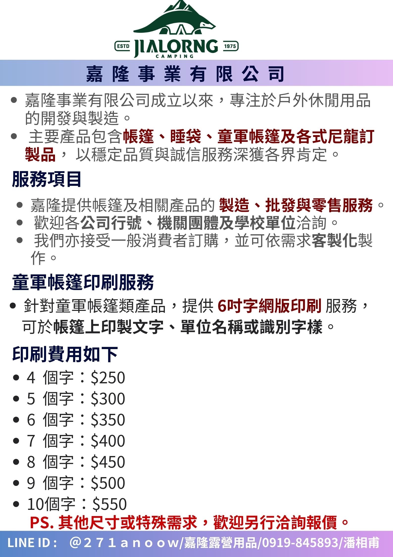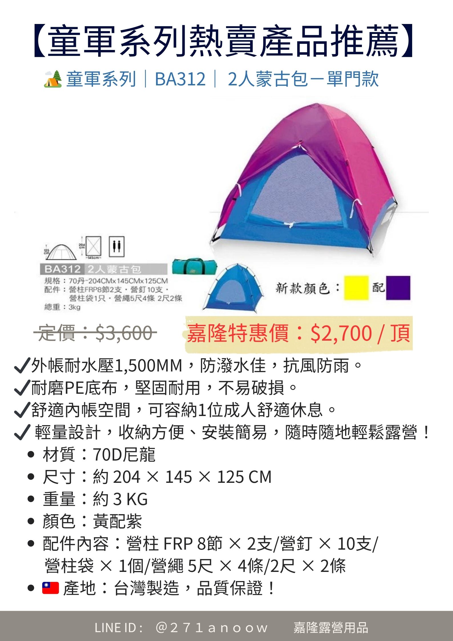 官方line ID: @276bawqn /@967yqucm(已滿) /嘉隆露營用品